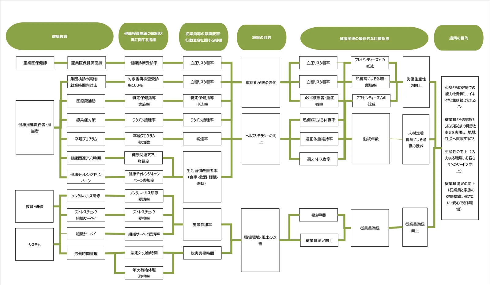 - 従業員満足の実現(従業員と家族の健康維持・増進、家庭・地域生活の充実)