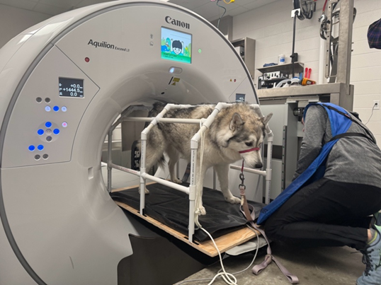 今月の研究における最大のトピックは、犬を立たせた状態のまま撮影するCT検査への取り組みです。
